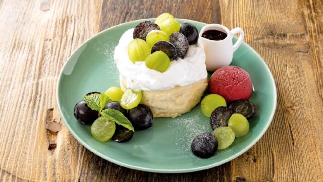 名取市パンケーキとともに旬の恵み、2種のぶどうを贅沢に 爽やかクリームとソースを添えて